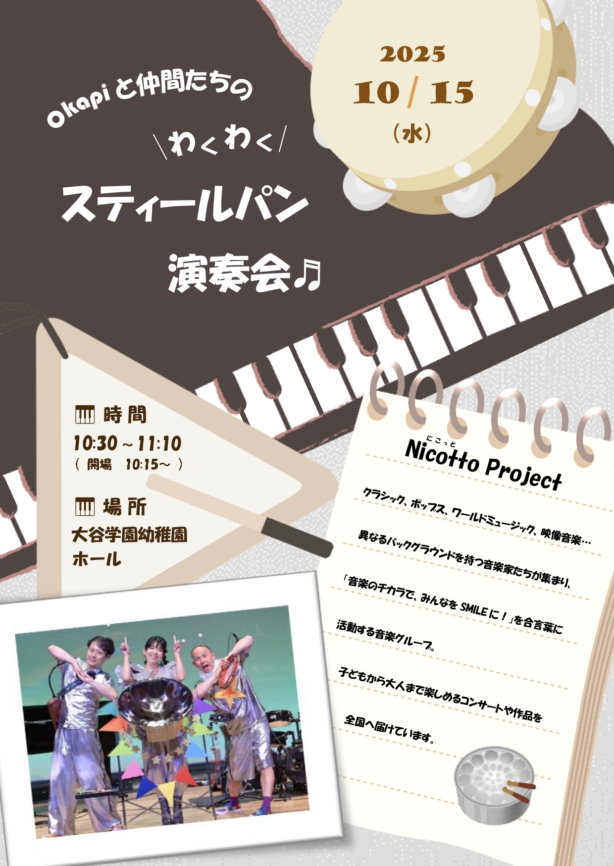 ![]() 2025年10月15日(水)に「Okapiと仲間たちのわくわくスティールパン演奏会」を開催いたします。 ご都合がよろしければ、是非お子様と一緒に遊びにいらしてください。 開催日:2025年10月15日(水) 時 間:10時30分~11時10分 ※開場:10時15分~ 場 所:大谷学園幼稚園 ホール ※正門からお入りいただき、2階ホールまでお上がりください。 持ち物:室内履き 同日から、令和8年度入園者向けの願書配布も実施いたします。 また、10時15分~11時30まで園庭開放も実施しております。 ![]() |
