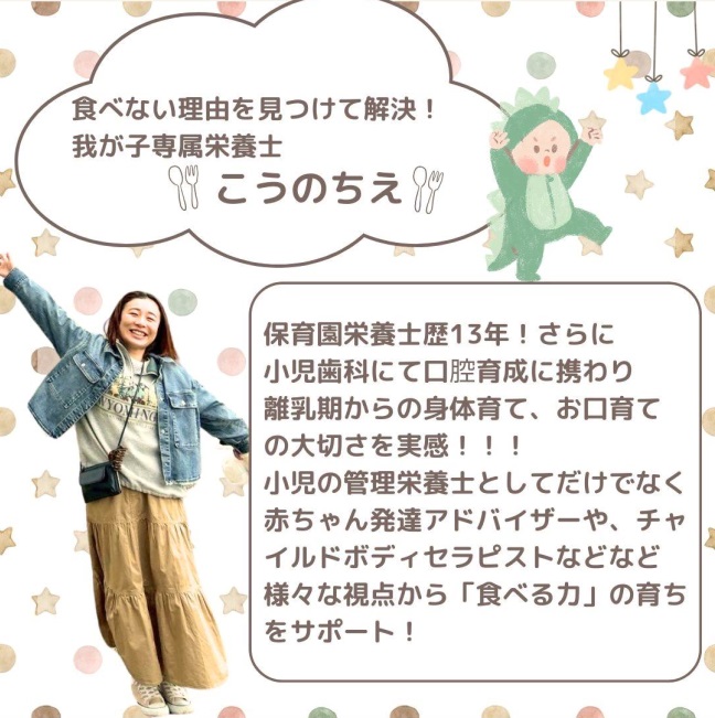 保育園栄養士として働く中で、「もっと子どもの発達を知って給食をつくりたい!」と、キッズヨガやベビーマッサージを学び、資格を取得。さらに、子育て支援施設で離乳食講座を開催するなど約300人の離乳に携わる。