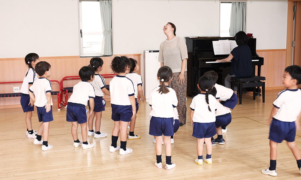 もっとみるリトミックは、月に2回・各30分程度、年中クラスで行っています。ピアノの音に合わせて身体を動かしたり、 歌を歌ったり、生の音楽を通して音感とりズム感を養います。テーマは季節毎に変わり、音楽に合わせてお散歩したり動物園へ出かけたり、 想像力を膨らませながら楽しみます。音を聞いて反応することで集中力を、また、お友だちと一緒に楽しむことで協調性を育みます。子どもたちが「音楽って楽しい!」と感じられる時間になるよう工夫しています。